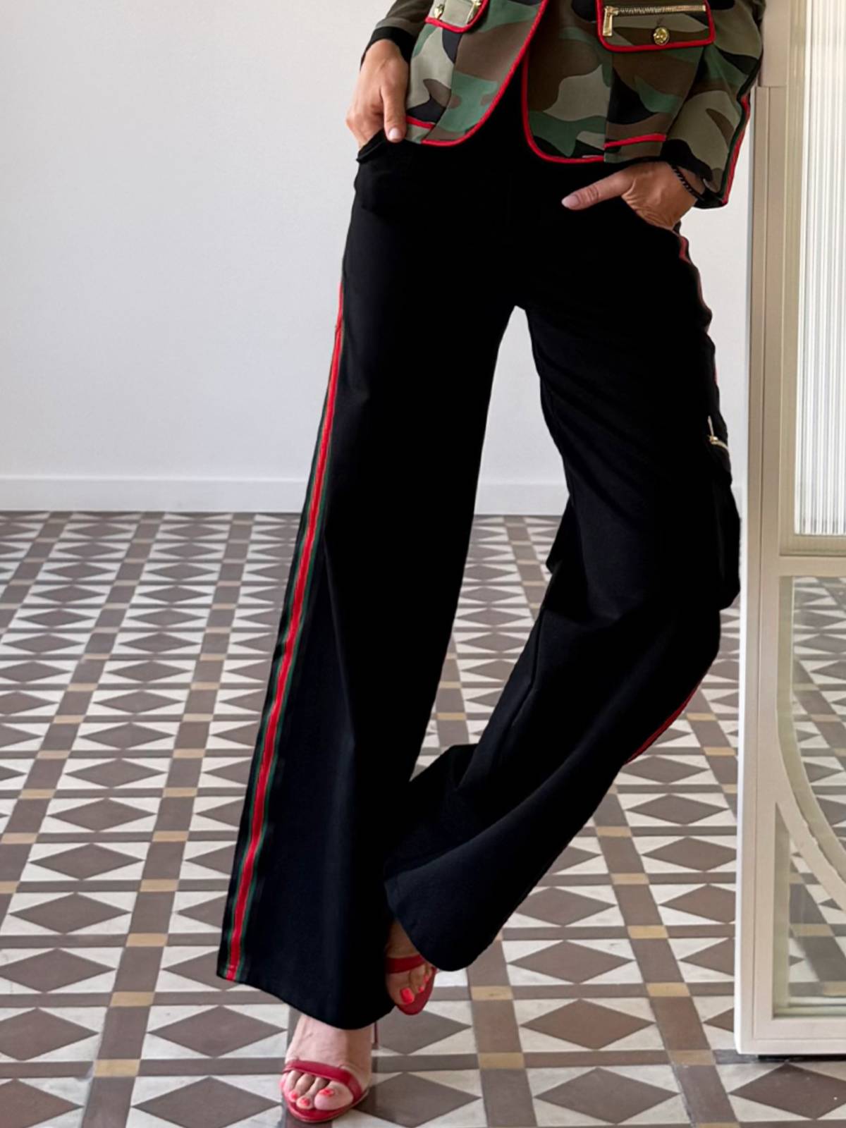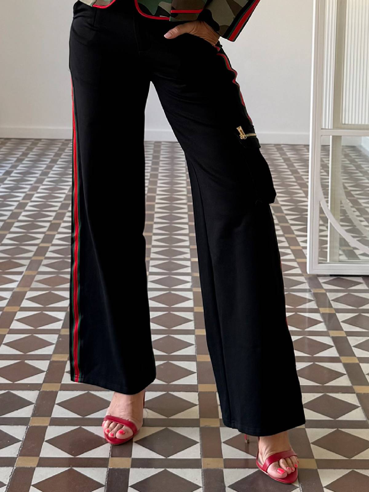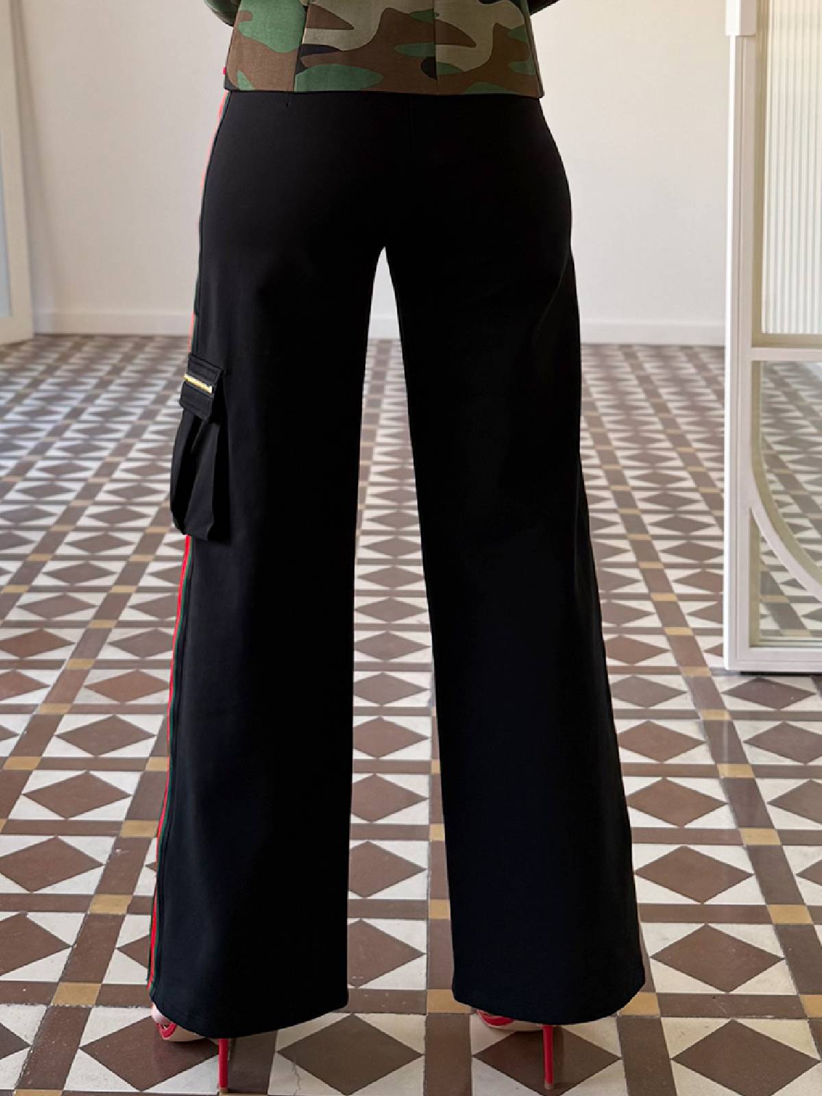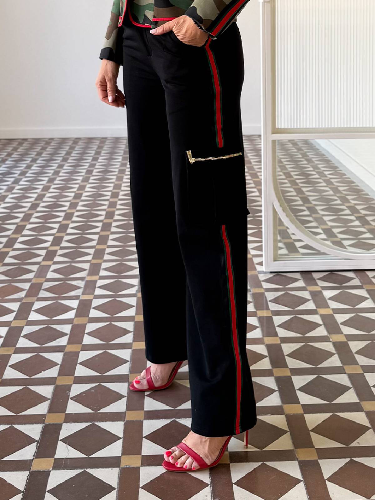 Pantalón cargo en color negro con franja lateral verde y roja. Bolsillos laterales con cremallera dorada. Doble bolsillo superior Se abrocha con botón y cremallera. Trabillas para cinturón.