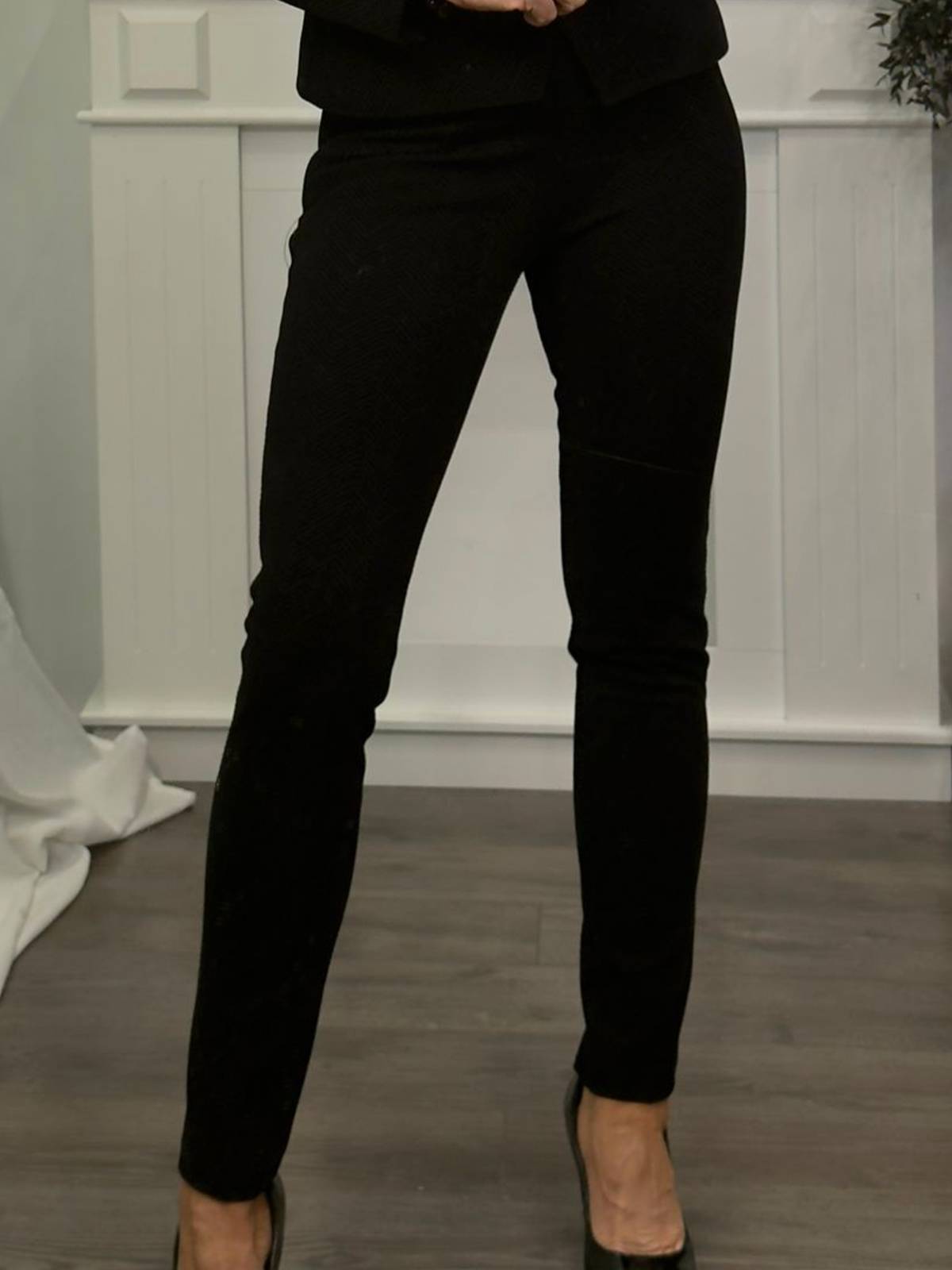 Pantalón negro, con estampado en relieve en tejido aterciopelado, de tiro medio y camal recto. Se cierra con cremallera invisible en el lateral. Composición: 96% poliéster, 4% elastano.