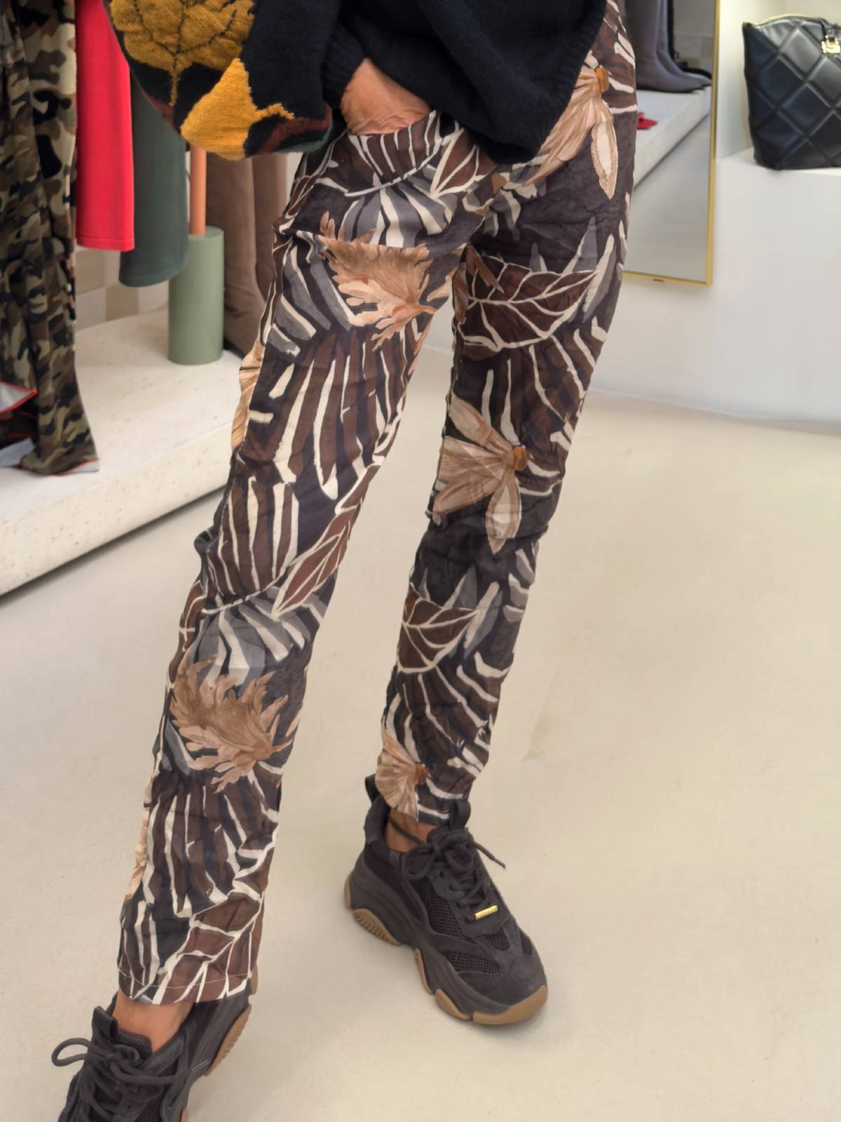 Calça elástica com estampa texturizada e cós elástico. Bolsos laterais e traseiros. Composição: 95% poliéster, 5% elastano.
