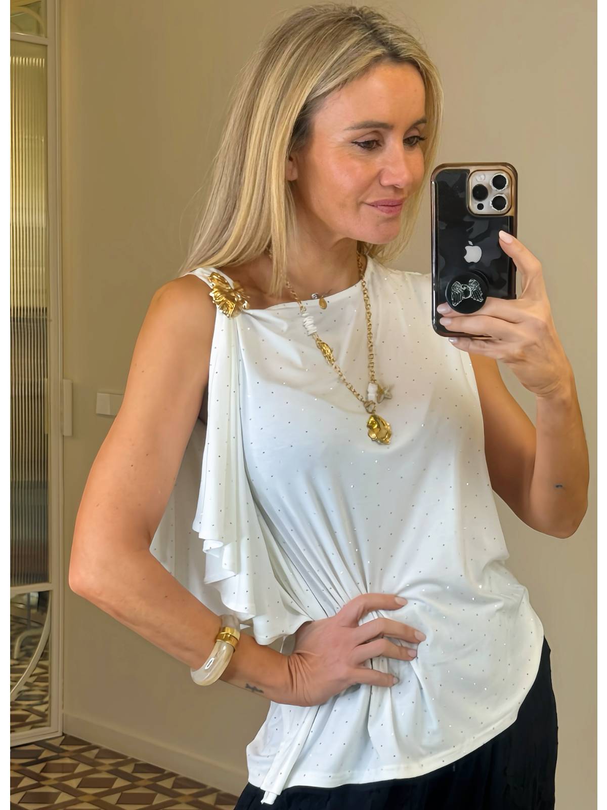 Top branco assimétrico com detalhes brilhantes. Sem mangas. Uma das mangas possui uma capa ampla. Detalhe dourado no ombro. Composição: 92% Viscose, 8% Elastano