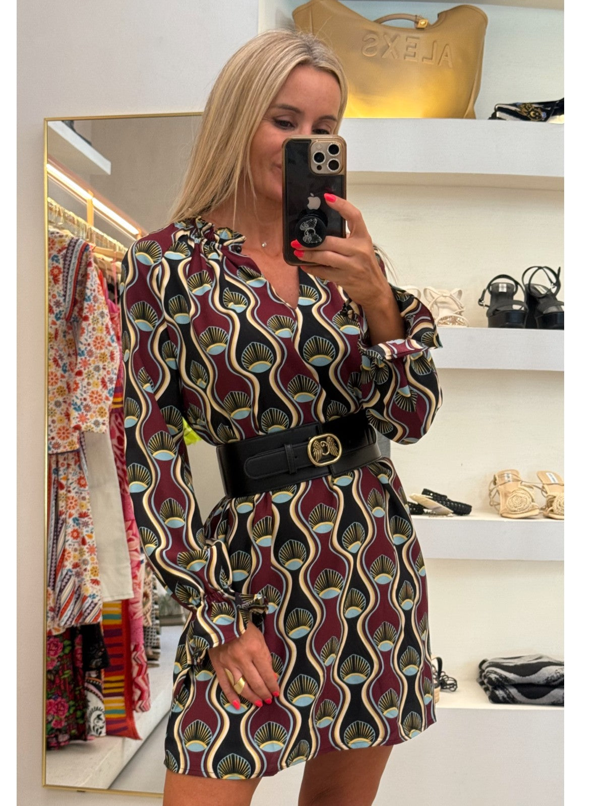 Vestido curto estampado, de mangas compridas, com gola abotoada. Composição: 100% poliéster.